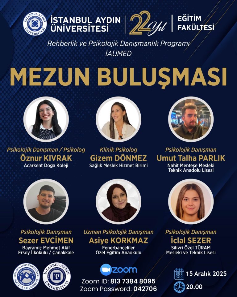 İstanbul Aydın Üniversitesi Mezunlar ve Mensupları Derneği ve Eğitim Fakültesi Rehberlik ve Psikolojik Danışmanlık Programı iş birliğiyle hayata geçirilen mezun buluşmamız, Zoom üzerinden başarıyla tamamlandı. Farklı dönemlerden mezunlarımız, görev aldıkları kurumları ve mesleki deneyimlerini paylaşarak değerli katkılarda bulundular. Katılım sağlayan…